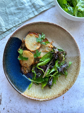 Blue plate with roasted salmon, vegetables, and a carbon rating label on the side.