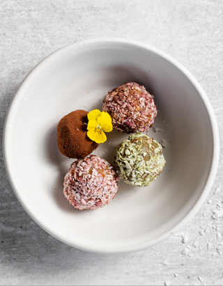 Three bowls of bircher muesli with various toppings and two packets of muesli mix, one with a rose and cardamon topping, and another with a mango and coconut topping.