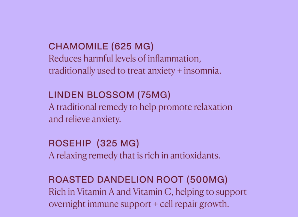 Sleep Teabags with Chamomile + Linden Blossom provide anti-inflammatory and anxiety-reducing benefits to help enable a restful, deeper sleep. Take it hot or cold in the evenings.