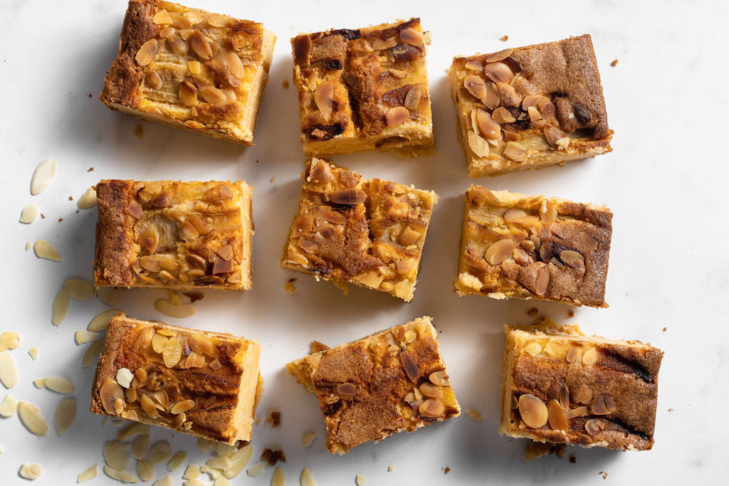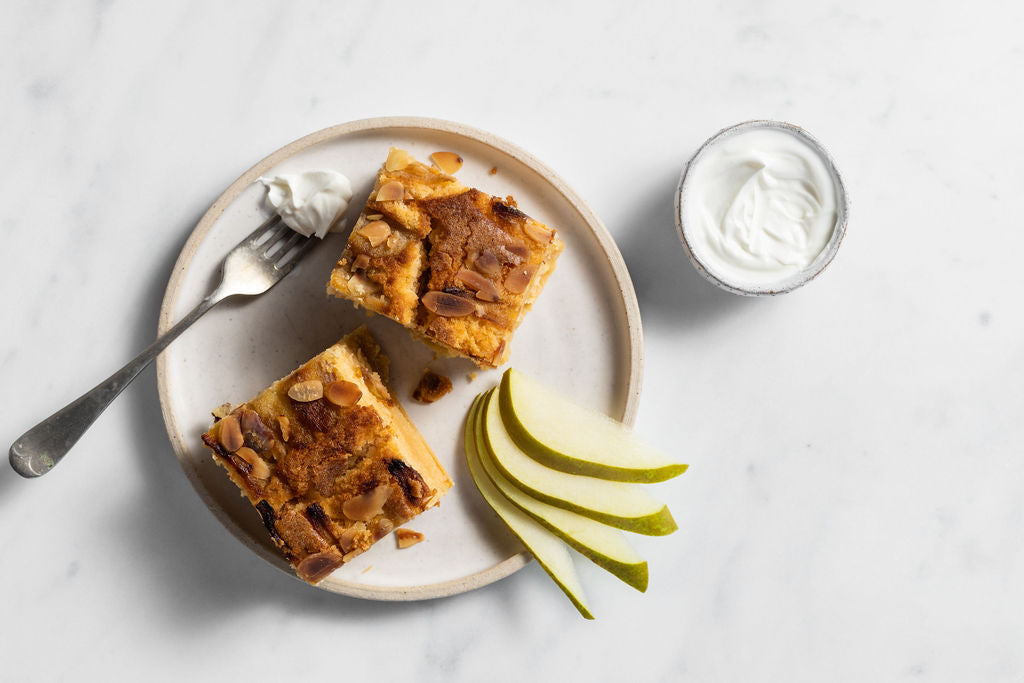 Pear Frangipani (100%) (Clarence Court Free Range Eggs, Golden Granulated Sugar, Almond Flour, GF Plain White Flour, French Butter (Milk), French Butter (Milk), Pears, Apricots (Sulphur Dioxide), Coconut Oil, Clarence Court Free Range Eggs, GF Plain White Flour, Whole Milk, Lemon Juice, Xanthan Gum, Caster Sugar, Ground Cinnamon, Almonds Flakes, Sea Salt)