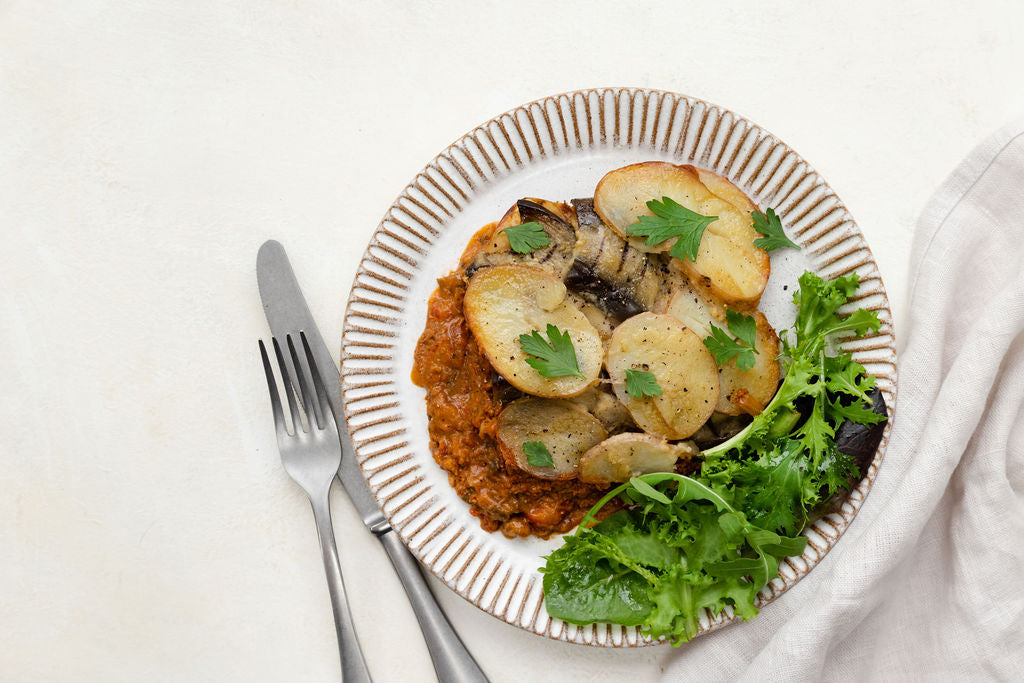 An authentic Greek moussaka made with grass-fed lamb slow-cooked with organic mushrooms and red wine, layered with aubergine and thinly sliced potatoes with a fragrant dairy free bechamel sauce.